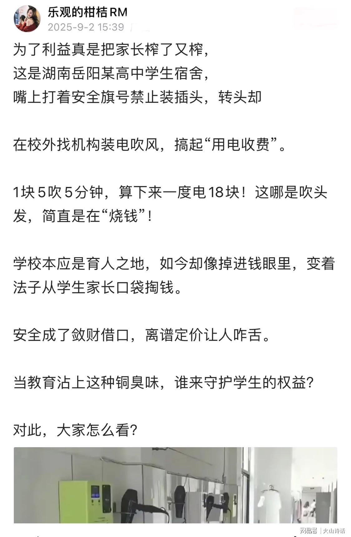 9月2日有网友爆料,为了利益真是把家长榨了又榨,这是湖南岳阳某高中学生宿舍,嘴上打着安全旗号禁止装插头,转头却在校外找机构装电吹风,搞起“用电收费”。1块5吹5分钟,算下来一度电18块!这哪是吹头发,简直是在“烧钱”!