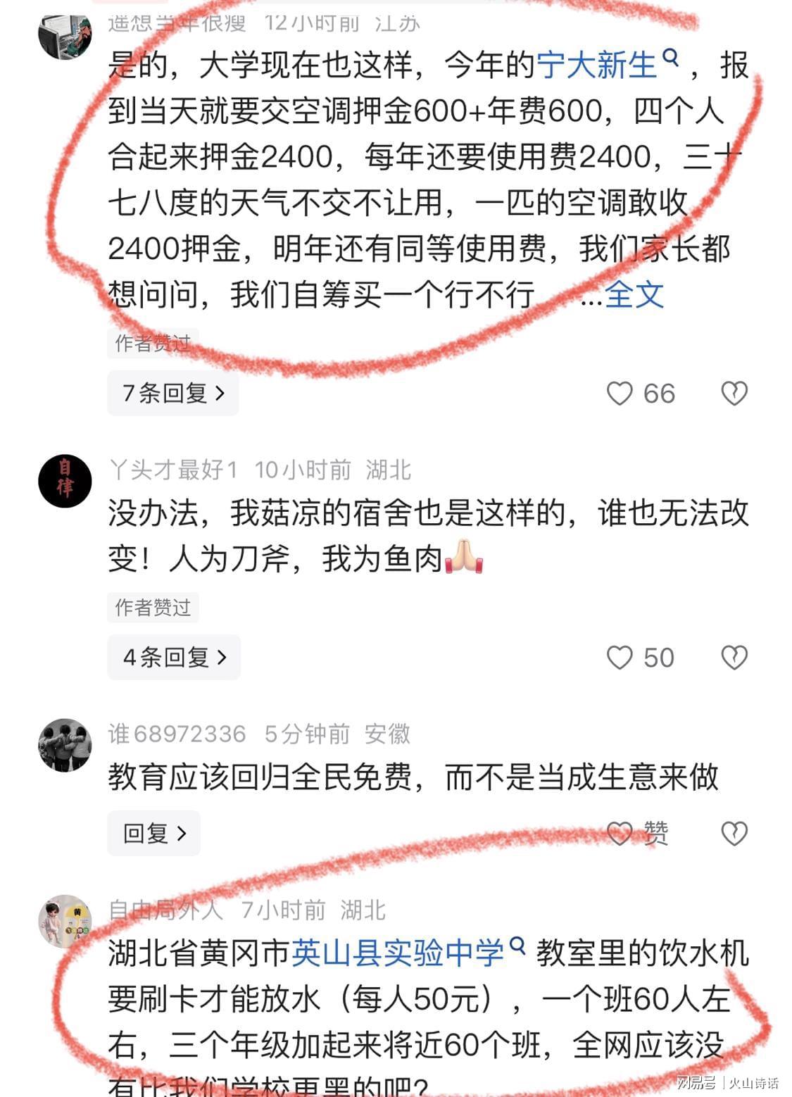 针对此事,有网友表示,是的,大学现在也这样,今年的宁大新生,报到当天就要交空调押金600+年费600,四个人合起来押金2400,每年还要使用费2400,三十七八度的天气不交不让用,一匹的空调敢收2400押金,明年还有同等使用费,我们家长都想问问,我们自筹买一个行不行。